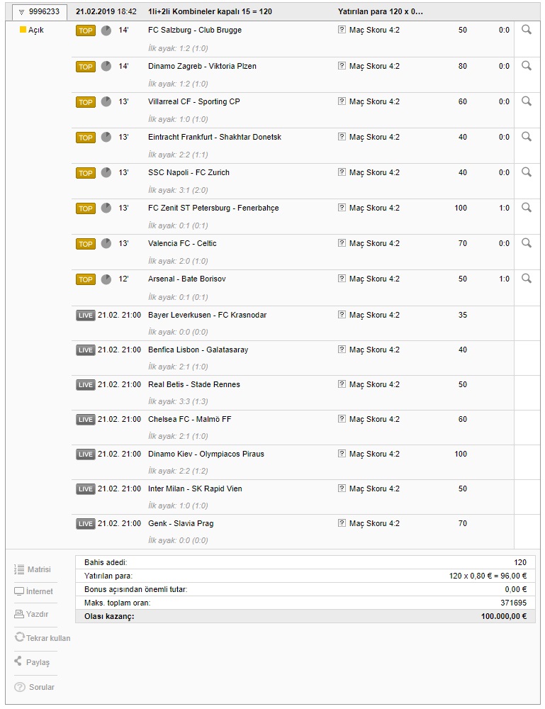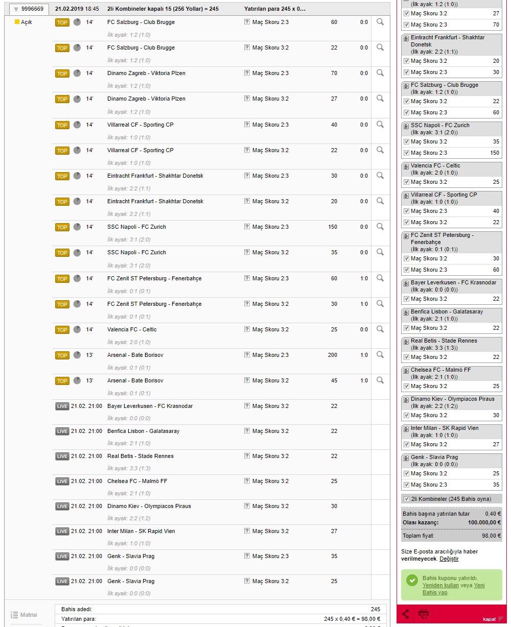 21 Şubat Avrupa Ligi Sistem Kuponlarım