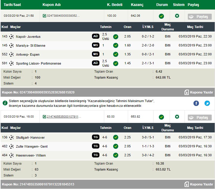 Uzun bir aradan sonra kupon tutturmanın tadına vardım Pazar günü. Şu maçları İddaa dışında oynasam kazancım 2 katı olurdu ya neyse… İddaa mı? bir daha asla 😀