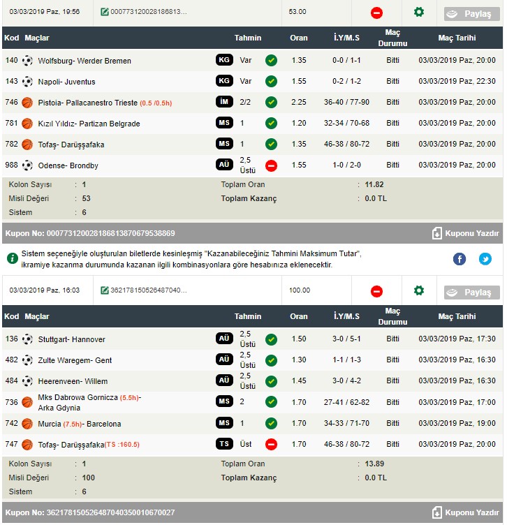 Bunlar da dün tek maçtan yatan kuponlarım. İddaa’da Bahis Bozdur (Cashout) diye bir seçenek olsa kesin bozdururdum ama mecburen son dakikaya kadar boş umutlarla beklemek zorunda kaldım 😀