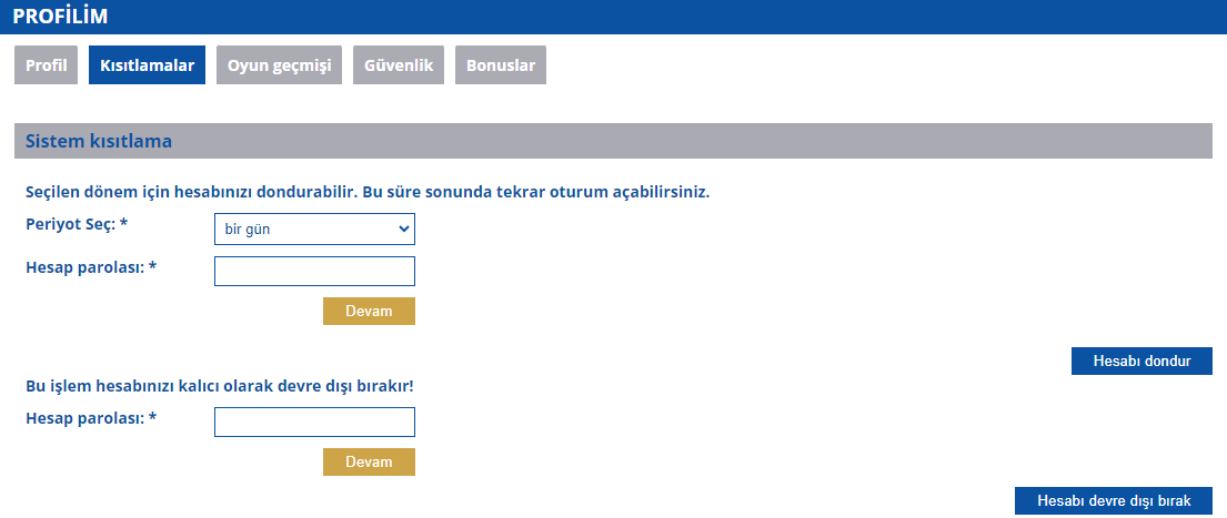 Yukarıdaki adımları yaptıktan sonra ise karşınıza görseldeki ekran çıkacaktır. Bu görselde de gözüktüğü gibi dilerseniz ayarlayabileceğiniz periyotta hesabınızı dondurabilirsiniz. Veya aşağıdaki seçenekte gözüktüğü gibi parolanızı girerek Tümbet üyelik iptali işlemini yapabilirsiniz.