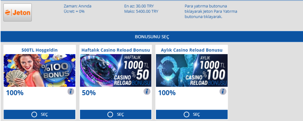 Hesabına Jeton Cüzdan ile yatırım yapmak isteyen oyuncular için bonus seçenekleri aşağıdaki gibidir;